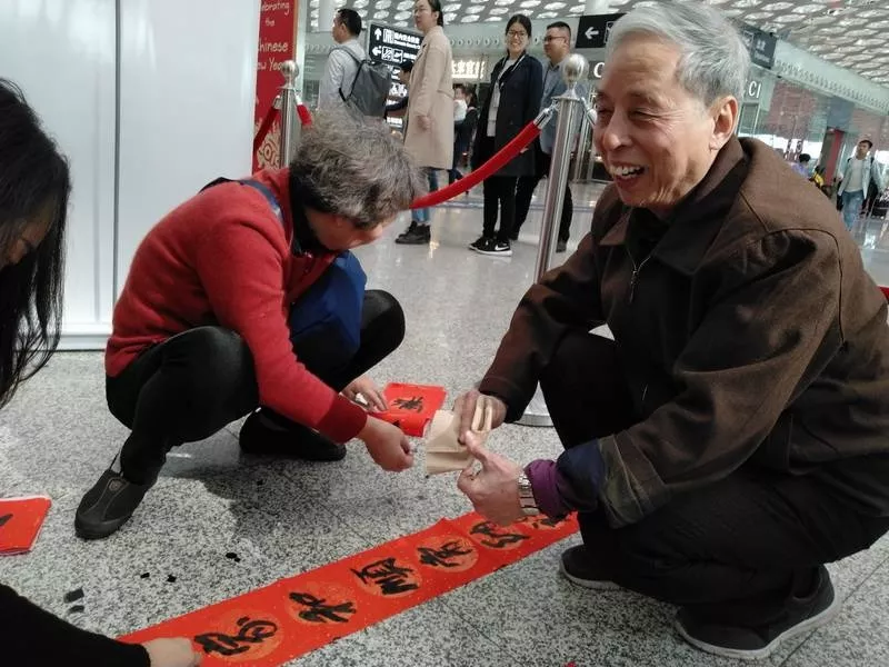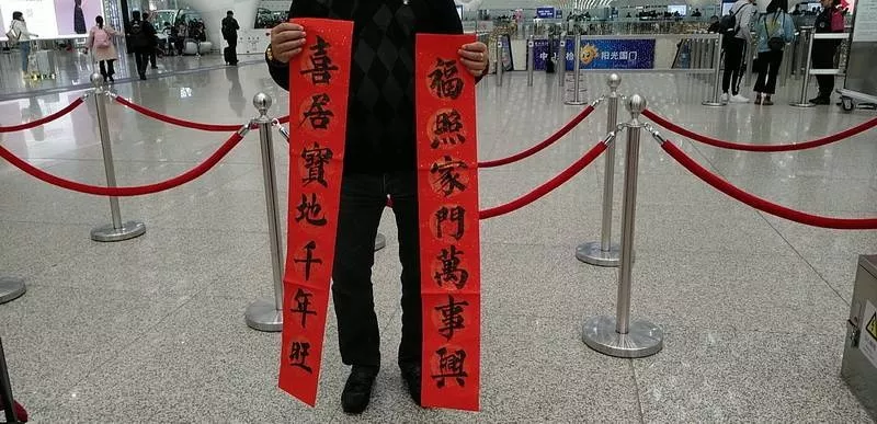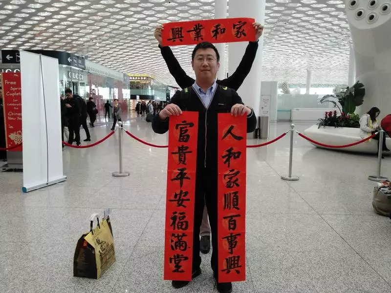 來領(lǐng)春聯(lián)的旅客里有國內(nèi)輾轉(zhuǎn)回老家的,有回國過年的,也有特地去國外過年的。來自江西婺源的曾老先生11點(diǎn)多的飛機(jī)飛往馬來西亞,今年他和老伴、孩子將在馬來西亞過年。他選的這兩幅春聯(lián)是他對新年的希望與祝福,將帶到馬來西亞貼起來,給新年增添年味兒?!拔疫€可以送給朋友,這是最好的禮物,他們一定會喜歡的?!痹壬吲d地說。