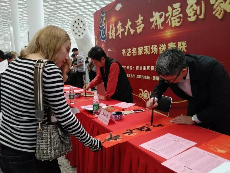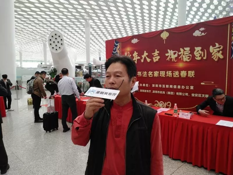 寶安區(qū)書法家協(xié)會主席李高揚(yáng)介紹,在機(jī)場送春聯(lián)很有意義,可以給全國各地的朋友們送上新年祝福。這次深圳發(fā)布廳攜手深圳機(jī)場舉辦活動,寶安區(qū)書法家協(xié)會集結(jié)高手出動為群眾服務(wù),為市民送去祝福。他祝大家新春快樂,闔家幸福。