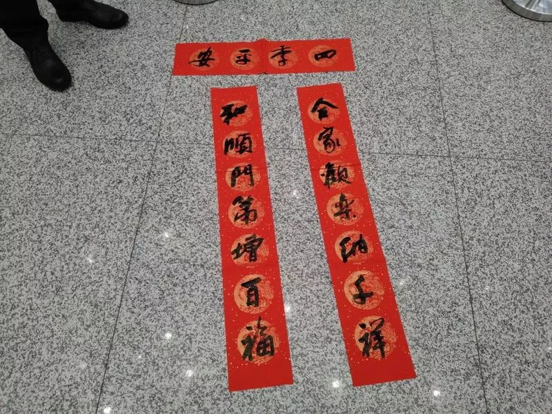 宋先生當(dāng)天10:50的飛機(jī)出發(fā)去上海再轉(zhuǎn)機(jī)回老家山東,他選擇了“人和家順百事興,富貴平安福滿堂”橫批“家和業(yè)興”,一個個“家”“安”“和”等字樣表達(dá)了他的新年愿望:希望家人平平安安。