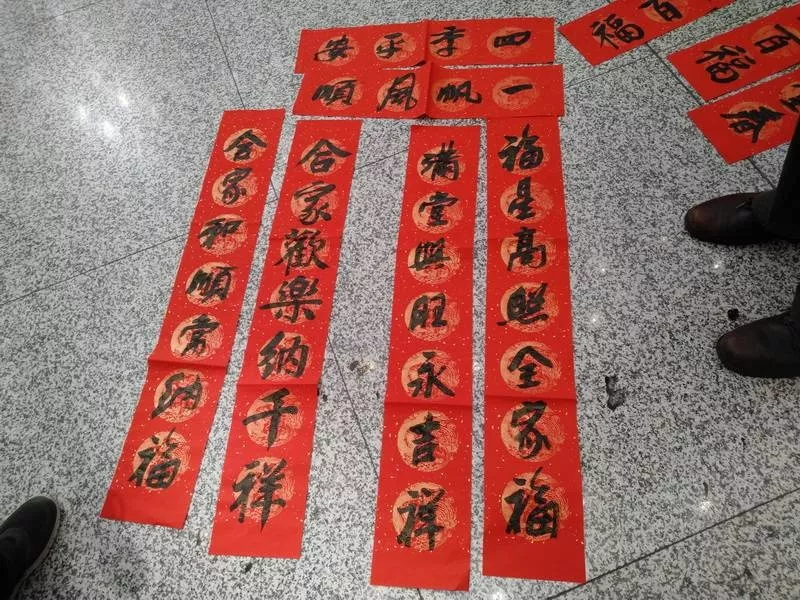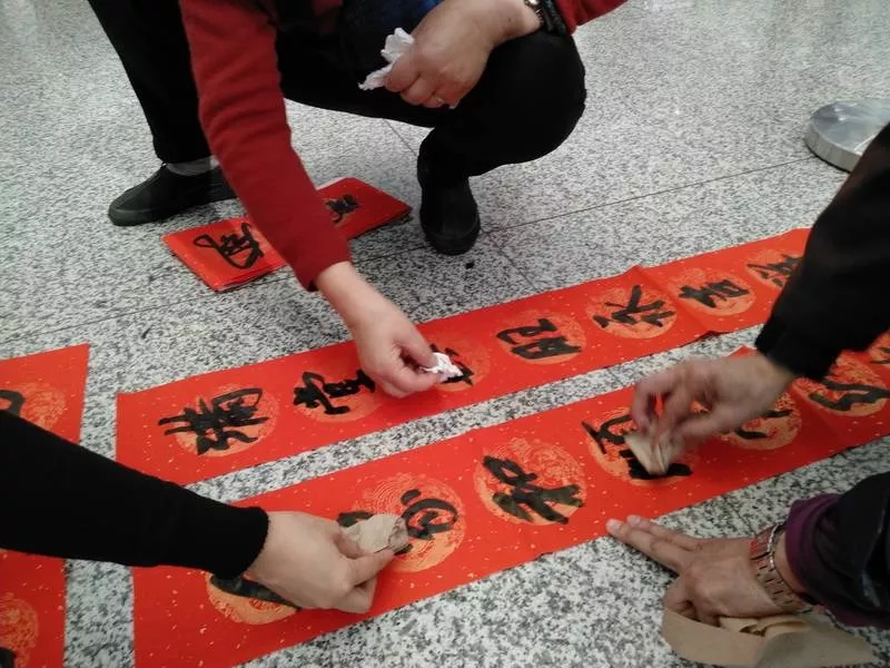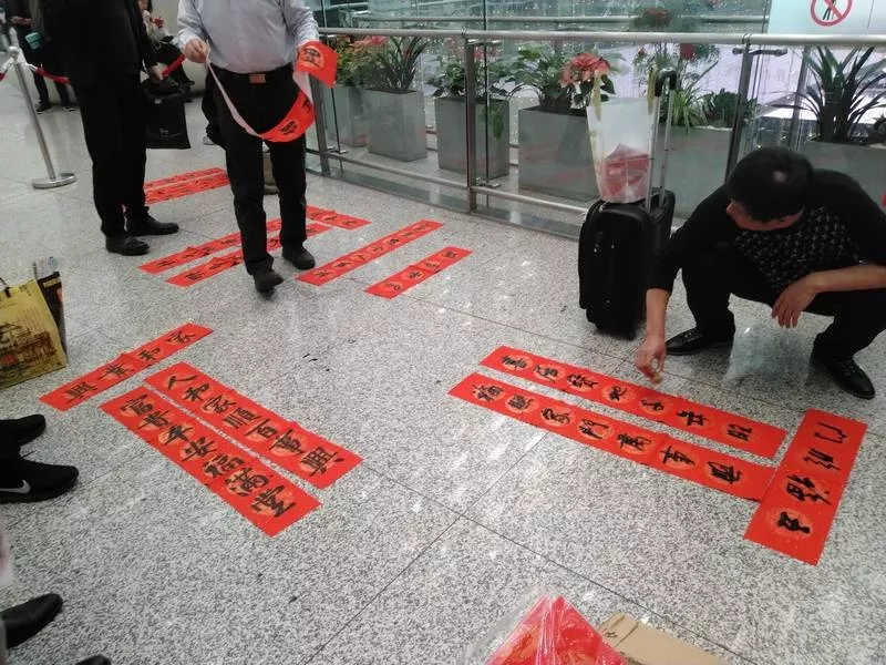 ▲旅客們拿到春聯(lián)后放在地上晾干。