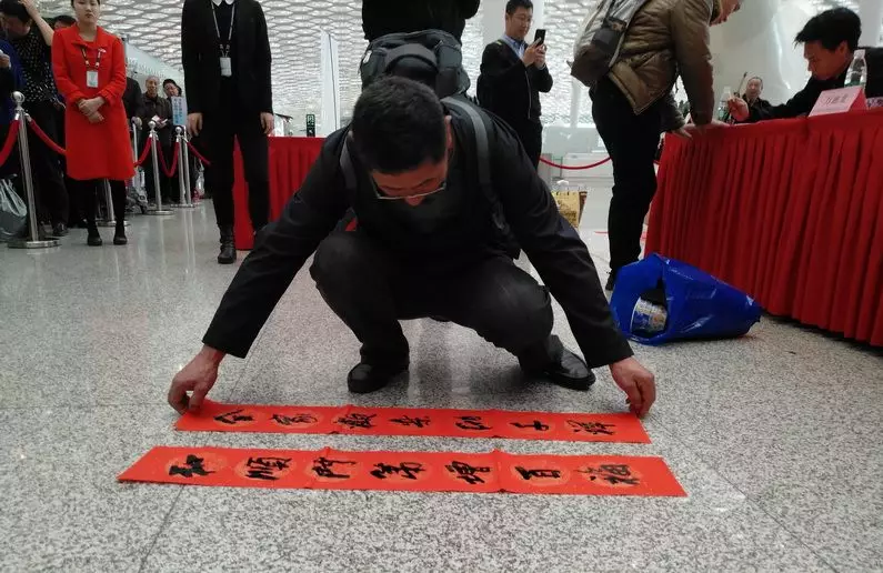 ▲越來越多的旅客來到送春聯(lián)活動現(xiàn)場,選好自己心儀的話語,由書法家們揮毫寫下。