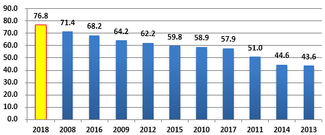 根據(jù)全市區(qū)域自動氣象站臺風(fēng)風(fēng)雨影響綜合年景指數(shù)計算結(jié)果,2018年臺風(fēng)風(fēng)雨影響綜合年景指數(shù)達到76.8,成為2008年以來最嚴(yán)重的一年,超過2008年的71.4。