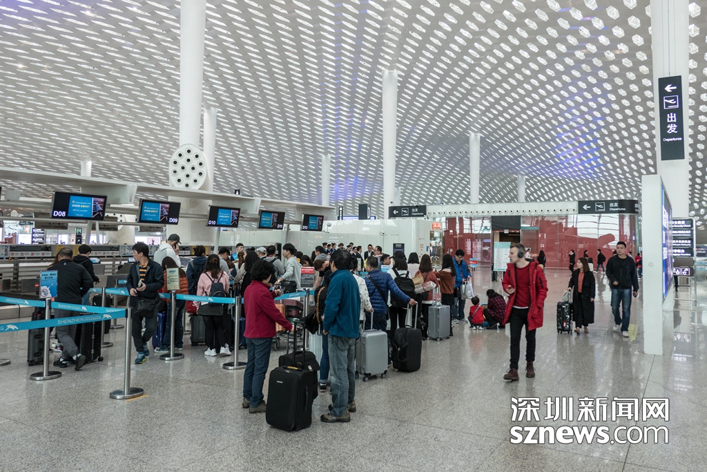 2月3日10:15,寶安機場出發(fā)大廳,旅客正在辦理行李托運手續(xù)(實習 生關天宇攝)