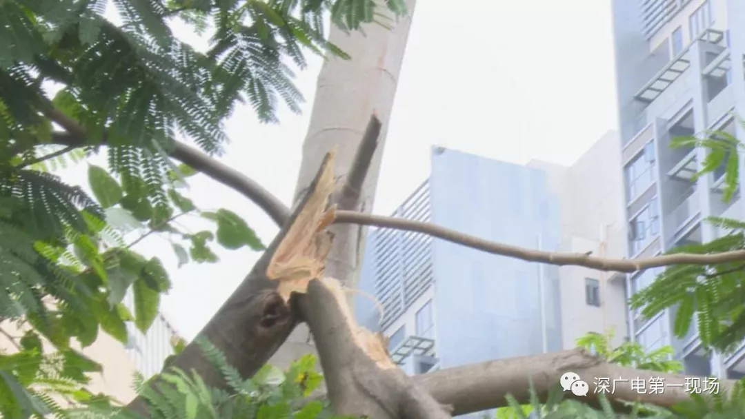 園林養(yǎng)護公司相關(guān)負(fù)責(zé)人介紹,這棵樹的樹名叫做南洋楹,記者觀察發(fā)現(xiàn),該路段種植的樹木基本都屬于這一樹種,但唯獨這一棵出現(xiàn)了樹枝折斷的情況。記者還在旁邊發(fā)現(xiàn)了一棵同樣的樹,樹干已經(jīng)被折斷,劉先生說,這還是去年9月份,被臺風(fēng)山竹吹斷的。像今天這種風(fēng)平浪靜的情況下斷枝,非常少見。