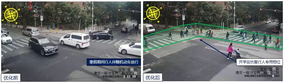 為保障校園周邊學(xué)生過街安全,深圳交警在校園周邊人流量密集的路口設(shè)置行人專用相位及行人綠波,開學(xué)期間共優(yōu)化行人過街路口94個。