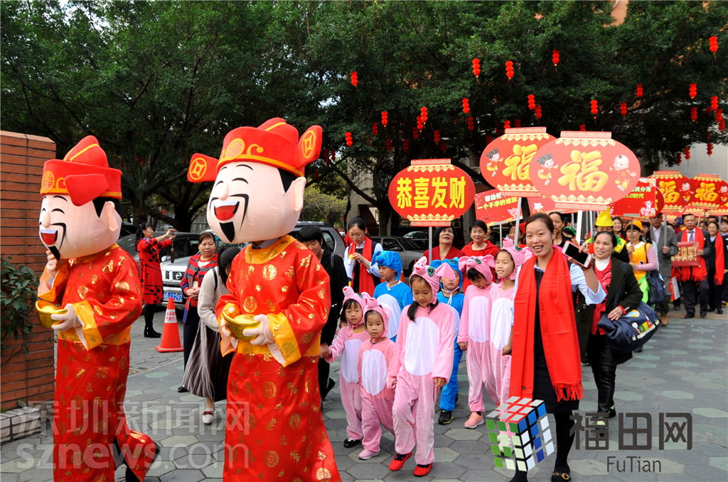 巡游方陣由梅林一村村民、梅林一村義工、梅林一村老年協(xié)會、梅林一村管理處員工組成。為了此次大年初一的大巡游,他們已經提前一個多月進行排練了。據介紹,龐大的巡游隊伍由裝飾得美倫美奐的彩車開道,車上有財神爺坐陣,巡游的途中會給圍觀的村民送去象征生活甜蜜的賀年糖果。緊跟隨后的是:安塞腰鼓和喜慶秧歌方陣、舞龍和醒獅方陣、威風鑼鼓方陣、金豬賀年方陣、居民迎春方陣、環(huán)保方陣、歡樂員工方陣。