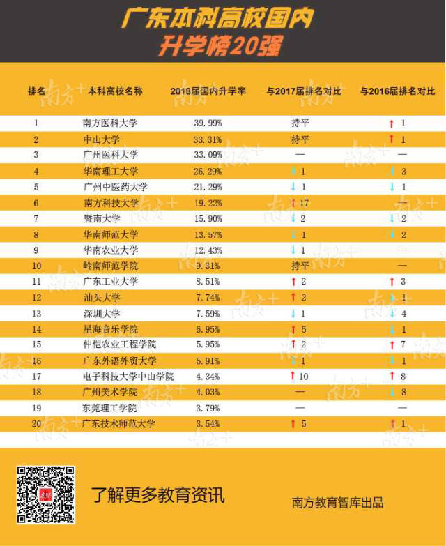 在發(fā)布“薪酬榜”后(點(diǎn)擊查看“薪酬榜”),今天南方教育智庫(kù)繼續(xù)獨(dú)家推出廣東高校“升學(xué)榜”,梳理全省123所高校發(fā)布的《2018年畢業(yè)生就業(yè)質(zhì)量年度報(bào)告》的關(guān)鍵數(shù)據(jù),聚焦畢業(yè)生的深造路徑和升學(xué)比例。其中南方醫(yī)科大學(xué)、中山大學(xué)、廣州醫(yī)科大學(xué)本科畢業(yè)生國(guó)內(nèi)升學(xué)率位列前3名,均超過(guò)33%。