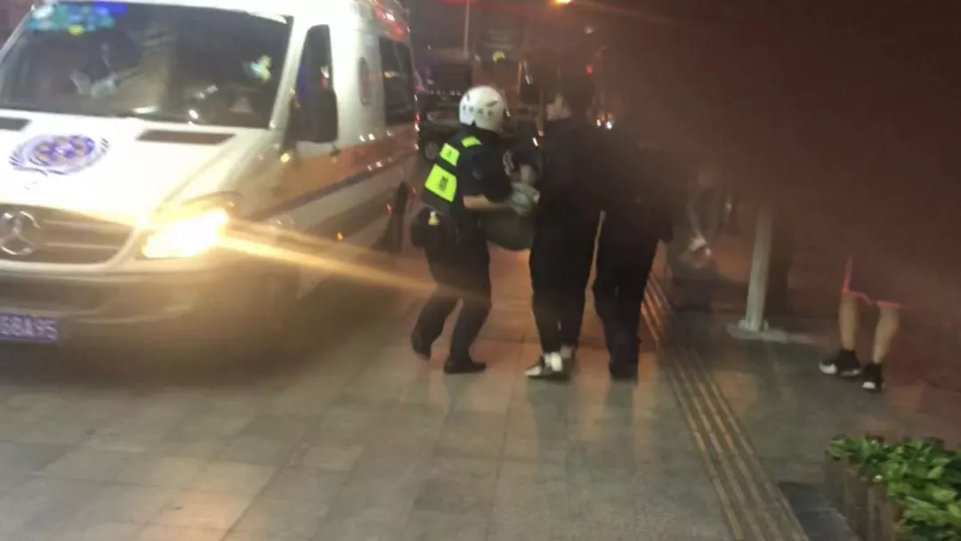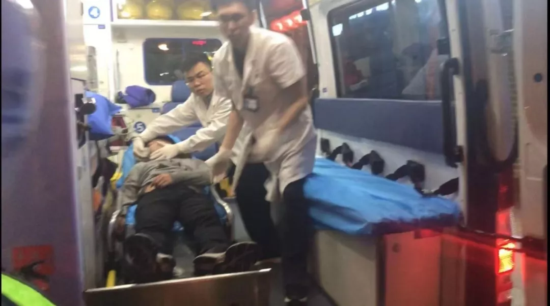 救護(hù)車趕到現(xiàn)場,隊員們爭分奪秒將男子抬上救護(hù)車。