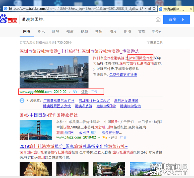 深圳市消委會模擬消費者網(wǎng)絡(luò)搜索實際使用場景,在百度搜索中搜索“港澳游國旅”等關(guān)鍵詞,進行了專項測試調(diào)查。調(diào)查發(fā)現(xiàn),搜素“港澳游國旅”等關(guān)鍵詞時搜索頁面會出現(xiàn)加V等級認(rèn)證的旅行社廣告信息,但經(jīng)核實,“深圳信用網(wǎng)”商事主體登記信息中并無該企業(yè)。