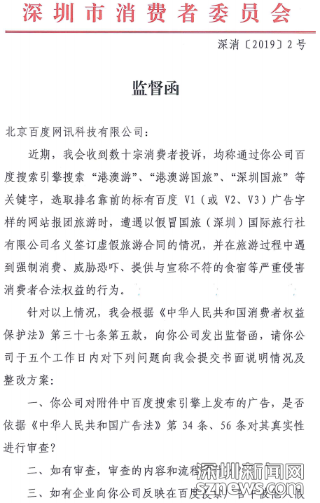 2月26日上午,深圳市消費者委員會(以下簡稱“深圳市消委會”)就春節(jié)期間,不少外地消費者通過百度搜索廣告報名港澳游“野馬”旅行社上當(dāng)被騙的問題,召開港澳游“野馬”旅行社投訴調(diào)查情況通報會,通報投訴調(diào)查進展情況。