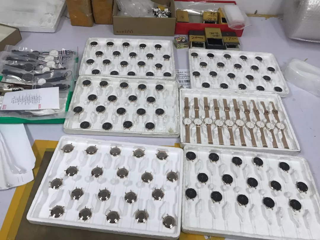 2018年6月21日,深圳市公安局經(jīng)偵支隊(duì)聯(lián)合市市場(chǎng)監(jiān)管部門開展打擊假冒DW品牌手表、FOREO等品牌潔面儀收網(wǎng)行動(dòng),共出動(dòng)警力110人,查處窩點(diǎn)13個(gè),刑拘犯罪嫌疑人12人?,F(xiàn)場(chǎng)查扣假冒DW品牌手表13500塊,表帶、表殼、后蓋等配件43000個(gè)以及包裝盒、標(biāo)簽12000余個(gè),現(xiàn)場(chǎng)查扣假冒產(chǎn)品價(jià)值1200萬元人民幣,總涉案金額3000余萬元人民幣。查扣假冒各品牌美容產(chǎn)品、半成品和商標(biāo)標(biāo)識(shí)11798件,查扣假冒產(chǎn)品價(jià)值人民幣500萬元。經(jīng)查,上述犯罪團(tuán)伙在未經(jīng)注冊(cè)商標(biāo)所有人許可的情況下,擅自使用注冊(cè)的商標(biāo)圖案組裝、翻新假冒DW品牌手表、FOREO品牌潔面儀。經(jīng)商標(biāo)權(quán)利人鑒定,現(xiàn)場(chǎng)查獲的手表和美容儀為假冒其注冊(cè)商標(biāo)的產(chǎn)品。