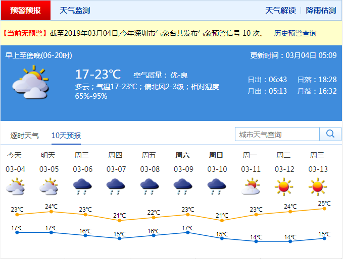 據(jù)市氣象臺消息,今天,深圳多云到陰天;氣溫17-19℃;相對濕度75%-95%;能見度普遍在10公里以上。受冷空氣影響早晨氣溫較昨天下降3-4℃,天氣清涼,注意及時添加衣物。 5日多云,部分時間可見陽光;6-10日冷暖空氣交替影響,云量較多,降雨頻繁,間中有雷雨,天氣清涼。