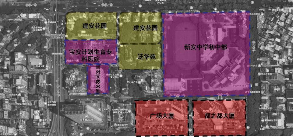 新安中學(xué)初中部片區(qū)位于寶安區(qū)新安街道,由建安一路、創(chuàng)業(yè)二路、寶民一路與興華二路四條道路圍合而成,面積約0.13平方公里,區(qū)域內(nèi)部有建順一路、建順二路以及建順二路一巷等支路。