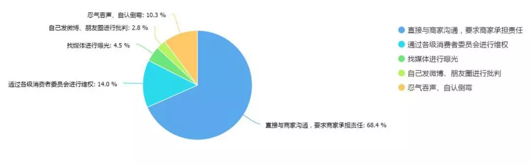 有68.4%的受訪者在遇到消費(fèi)侵權(quán)后選擇直接與商家溝通,要求商家承擔(dān)責(zé)任,10.4%的受訪者會(huì)選擇忍氣吞聲、自認(rèn)倒霉;其中男性消費(fèi)者更傾向于找媒體曝光,而女性消費(fèi)者則傾向于忍氣吞聲。