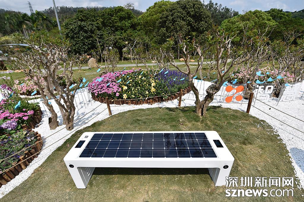 智能座椅被放置在花園中,該座椅利用太陽能發(fā)電,可以進(jìn)行無線和有線充電