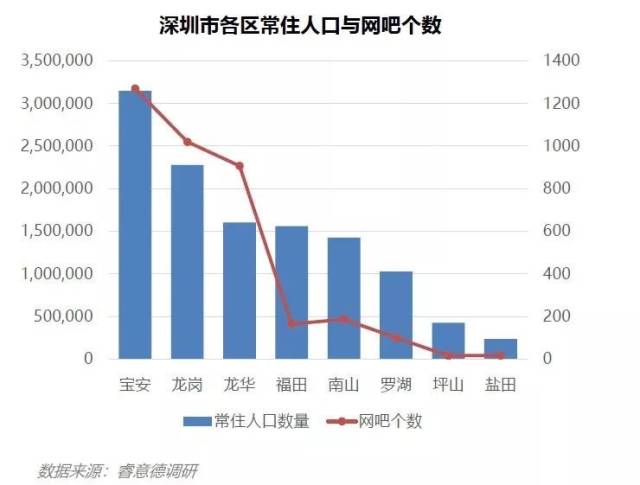研究報告顯示,寶安、龍華、龍崗三區(qū)網(wǎng)吧數(shù)量顯著較高,這些區(qū)外來人口基數(shù)龐大,網(wǎng)吧市場發(fā)展空間相對較大。而在南山、福田、羅湖地段,租金相對較高,只有營收能力相對較強的新型網(wǎng)吧才有生存空間。