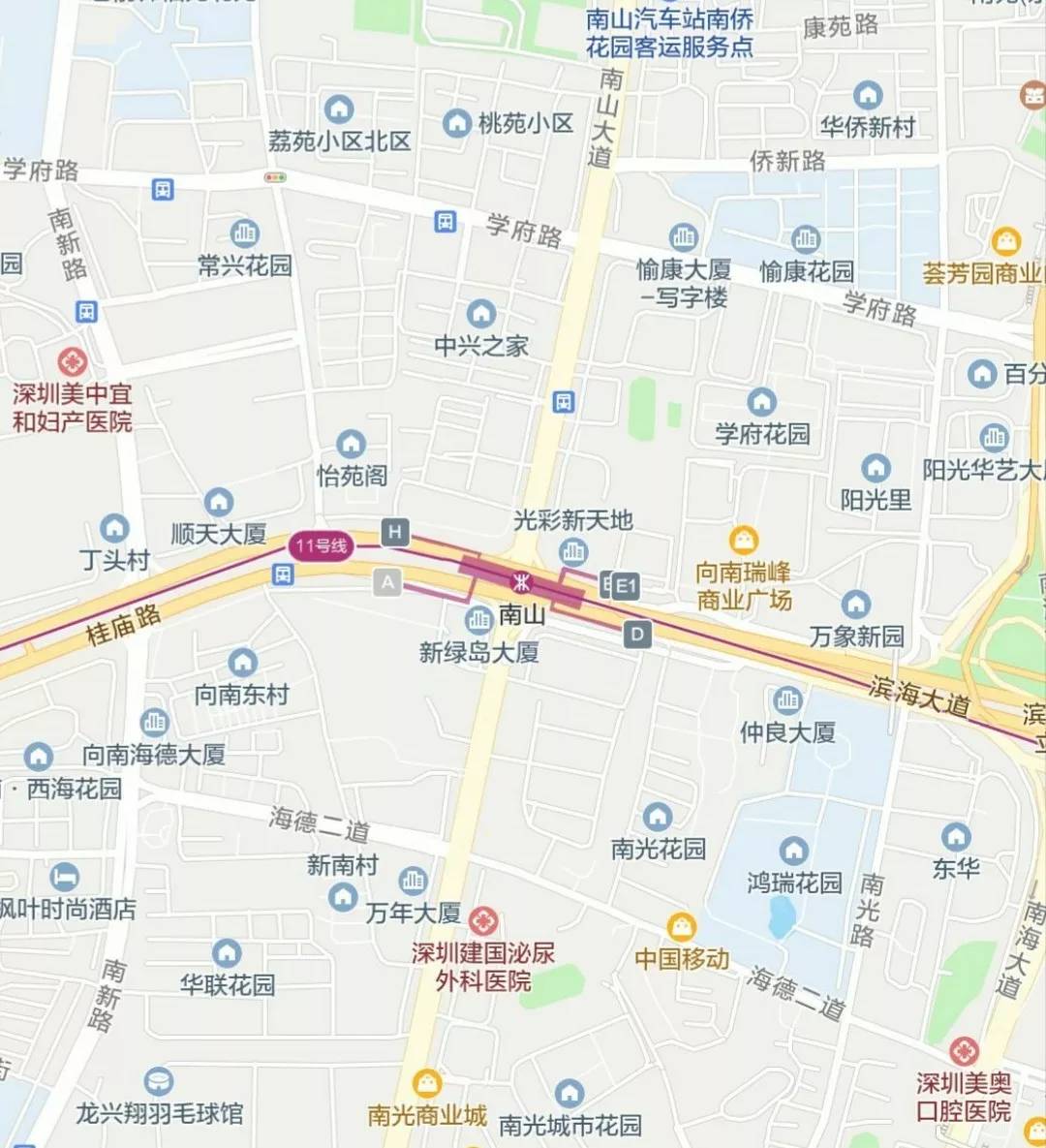 南山站總共有5個(gè)出入口,A口位于南山大道南側(cè)、桂廟路西側(cè),需要乘車的市民請(qǐng)從D口、H口、E1口、E2口進(jìn)站乘車。