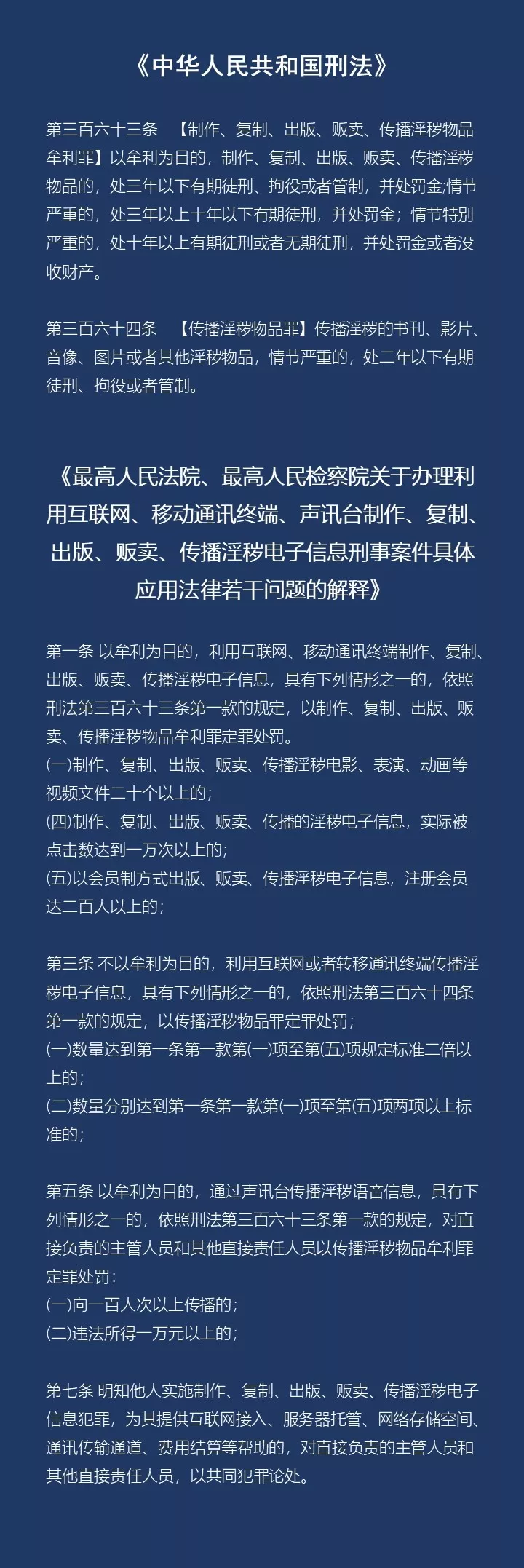我國《刑法》規(guī)定了對傳播淫穢物品牟利罪、傳播淫穢物品罪的處罰,而最高法、最高檢2004年9月出臺的《關于辦理利用互聯(lián)網(wǎng)、移動通信終端、聲訊臺制作、復制、出版、販賣、傳播淫穢電子信息的刑事案件具體應用法律若干問題的解釋》,又對此類犯罪認定做了詳細的解釋。