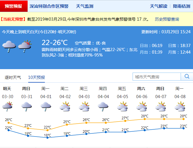 深圳新聞網(wǎng)2019年3月29日訊 記者從深圳氣象局了解到,昨天夜間到今天白天,我市多云,夜間到早晨有輕霧,局地大霧;早晨最低氣溫22-23℃,白天最高氣溫27-28℃;相對濕度70%-100%;南風(fēng)2-3級;昨天夜間能見度1-5公里。東部局地有大霧能見度在1公里以下,白天能見度轉(zhuǎn)好達到10-20公里。