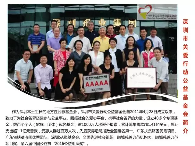 他說,深圳是一座因為廣泛開展關愛活動而更加令人矚目、受人尊敬的愛心之城,而深圳市關愛行動公益基金會就是為了推動關愛行動而誕生的。多年來,關愛基金會凝聚了數(shù)千萬人次愛心捐贈,推出和資助的關愛項目數(shù)千個,累計籌集善款逾2億元,公益支出超1.65億元,受惠人群數(shù)百萬人次。因此也榮獲深圳市首家5A級基金會、全國先進社會組織等系列榮譽??梢哉f,深圳市關愛行動公益基金會為深圳這座文明和諧的關愛之城做出了重大貢獻。而這愛心成果的背后,是在座各位及社會各界愛心人士的共同努力、共同愛心奉獻的結果!“關愛路長,善者致遠,今年是新中國成立70周年,是脫貧攻堅、決勝全面建成小康社會的關鍵之年。深圳作為改革開放的受益者,在新的歷史起點上,我們應繼續(xù)秉承深圳“關愛、感恩、回報”的精神,奮力擔當新的偉大歷史使命,為建設更加繁榮美好的祖國和幸福家園繼續(xù)努力!”