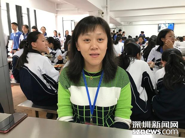 4月1日中午,深圳市福田區(qū)外國(guó)語(yǔ)學(xué)校校長(zhǎng)丁長(zhǎng)義跟學(xué)生一起在食堂就餐