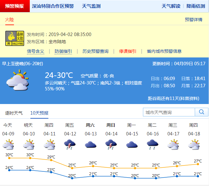 深圳新聞網2019年4月9日訊(記者 陳婕)昨天(8日)東門氣溫已經率先突破31℃,全市大部地區(qū)氣溫也在28℃以上了,預計暖濕天氣還會持續(xù)。深圳國家基準站記錄到最高氣溫29.7℃,為今年以來最高氣溫;相對濕度75%-95%;偏南風2-3級;能見度3-20公里。火險預警信號生效中。至于網友們關心的深圳什么時候入夏的問題,小記了解到,深圳平均入夏時間為4月21日,大家還是安心坐等夏天吧。