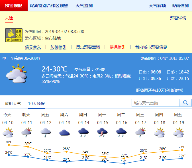 深圳新聞網(wǎng)2019年4月10日訊 超過30℃!深圳昨日氣溫創(chuàng)下2019年以來最高。記者從深圳市氣象局了解到,今日深圳市以多云間晴天天氣為主;氣溫在24-30℃;南風2-3級;相對濕度55%-90%。