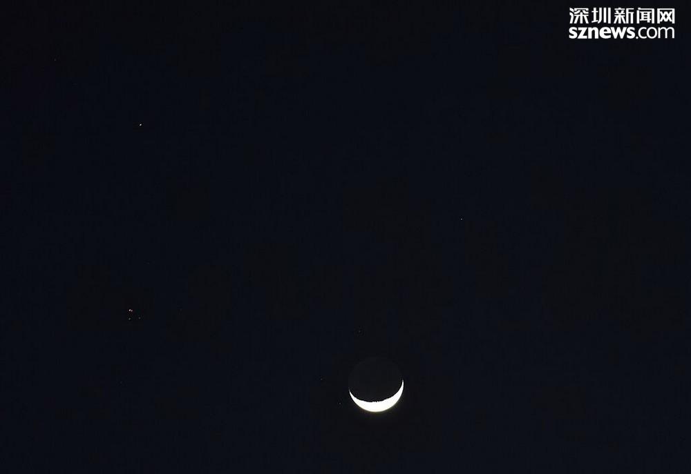 深圳新聞網(wǎng)2019年4月10日訊(記者 楊浩翰)相信不少市民朋友聽過“木星伴月”和“金星伴月”的概念。4月9日是農(nóng)歷初五,深圳的夜空中就出現(xiàn)了“雙星伴月”的天體現(xiàn)象。因為機緣巧合,昨晚彎彎的月亮從亮恒星畢宿五和火星中間路過,三者相聚在一起,就出現(xiàn)了“月亮笑臉”。