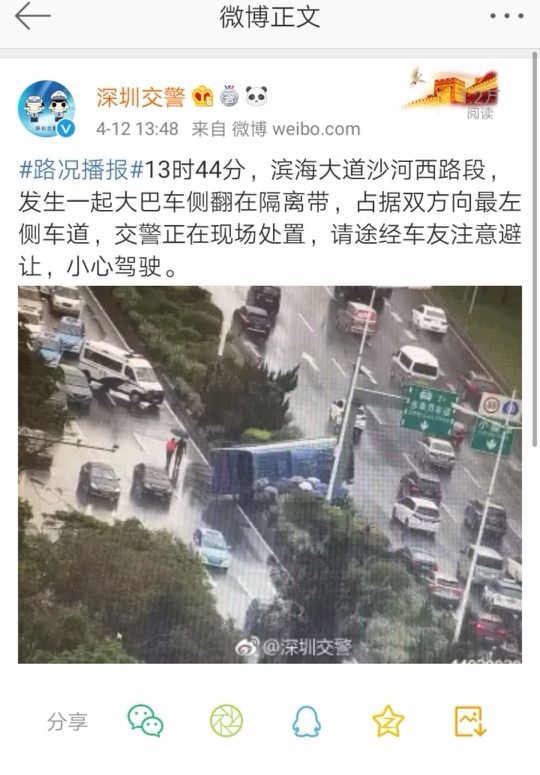深圳交警通過微博發(fā)布消息,提醒沿途司機(jī)注意避讓,小心行駛。