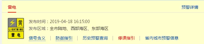 深圳市氣象臺(tái)于2019年04月18日16時(shí)15分在全市發(fā)布雷電預(yù)警,預(yù)計(jì)30-60分鐘內(nèi)全市將逐漸自西向東轉(zhuǎn)雷陣雨,按照防御預(yù)案停止戶(hù)外易燃易爆危險(xiǎn)作業(yè),并加強(qiáng)?;瘓?chǎng)所安全管理,正值下班放學(xué)高峰期,請(qǐng)注意防御。