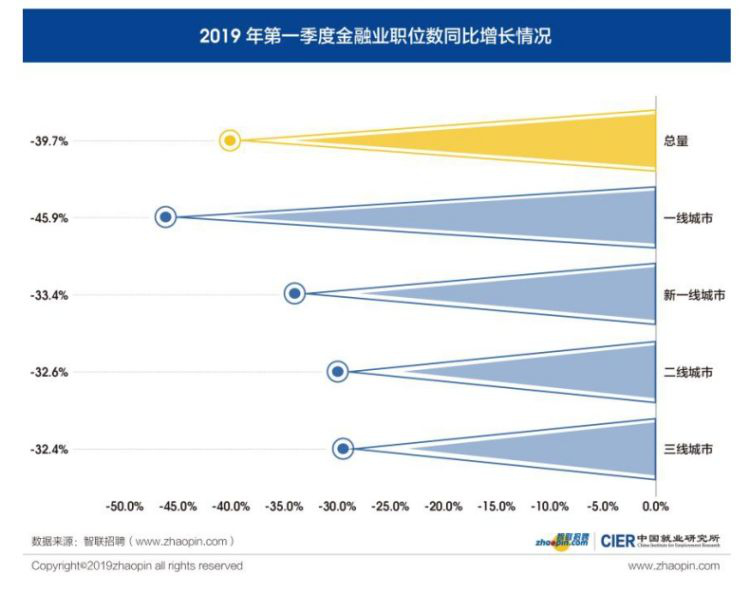 此外,調(diào)研顯示,備受矚目且高薪的金融行業(yè)本季度就業(yè)狀況并未隨著股市的回暖同步好轉(zhuǎn)。根據(jù)智聯(lián)招聘大數(shù)據(jù),金融業(yè)2019年一季度的招聘職位數(shù)降幅在所有行業(yè)中最高,達(dá)39.7%。其中一線城市金融行業(yè)職位數(shù)的降幅最大,為45.9%,新一線、二線和三線城市的降幅均在33%左右。2017年以來,強(qiáng)化監(jiān)管成為金融領(lǐng)域的主基調(diào),在去杠桿、防風(fēng)險(xiǎn)的同時(shí),金融行業(yè)發(fā)展速度有所放緩,向市場提供的就業(yè)機(jī)會(huì)也整體下降,這在互聯(lián)網(wǎng)金融等新興業(yè)態(tài)主要活躍的一線城市表現(xiàn)更為明顯。