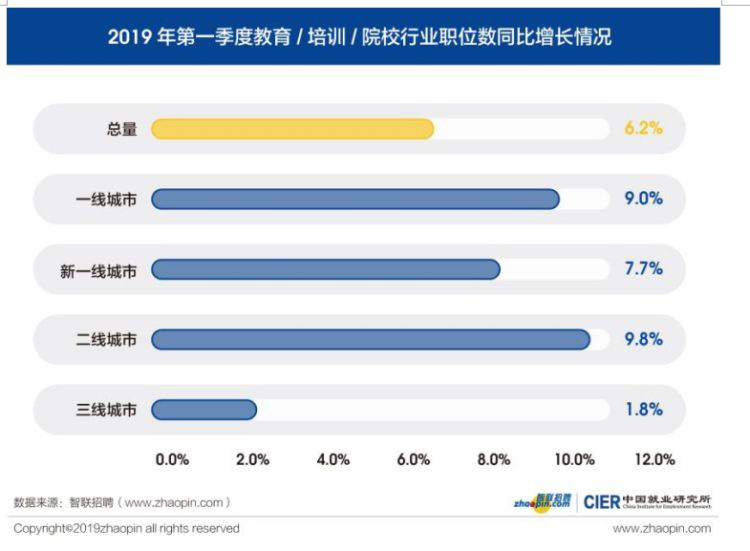 根據(jù)智聯(lián)招聘大數(shù)據(jù),本季度全國招聘職位數(shù)同比下降11.0%,但教育 /培訓(xùn) /院校的招聘需求逆勢(shì)上升,該行業(yè)招聘職位數(shù)量最大、貢獻(xiàn)就業(yè)崗位最多。受經(jīng)濟(jì)轉(zhuǎn)型帶來人才需求結(jié)構(gòu)變化、傳統(tǒng)教育無法滿足市場需求、個(gè)人學(xué)習(xí)意識(shí)增強(qiáng)等綜合因素影響,教育 /培訓(xùn) /院校行業(yè)近年來快速發(fā)展,由于其用工需求量較大,就業(yè)貢獻(xiàn)十分可觀。同時(shí),隨著二三線城市家庭收入的增長和在線教育硬件普及率的提高,教育培訓(xùn)機(jī)構(gòu)的用人需求正逐漸向二三線城市下沉。