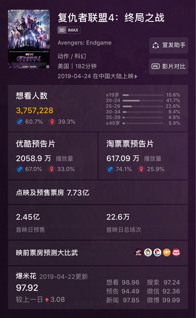 值得注意的是,淘票票×優(yōu)酷雙端合并平臺(tái)的“想看+預(yù)約”數(shù)超500萬(wàn),雙端預(yù)告片播放量破2600萬(wàn),打破進(jìn)口片想看+預(yù)約”紀(jì)錄,成為全網(wǎng)第一。淘票票打造的“漫威社區(qū)”突破450萬(wàn)訪問,“想看人數(shù)”達(dá)到370萬(wàn)(如圖),想看、評(píng)分和評(píng)論都是平臺(tái)沉淀下的重要數(shù)據(jù),它代表著用戶粘性和平臺(tái)依賴度。