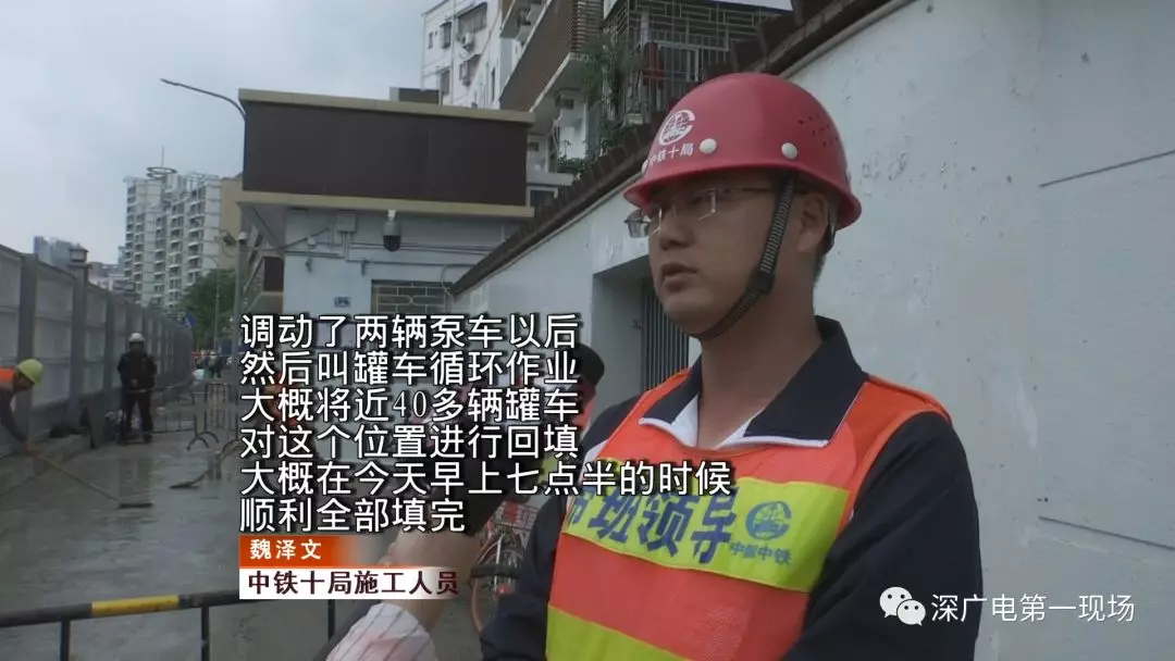 路面坍塌情況發(fā)生后,該路段也第一時間被封閉,由附近的桂廟路快速化改造工程二標(biāo)施工方中鐵十局進(jìn)行應(yīng)急處置,往塌陷位置灌注混凝土。
