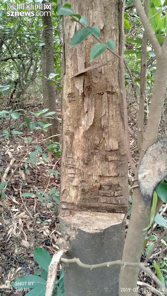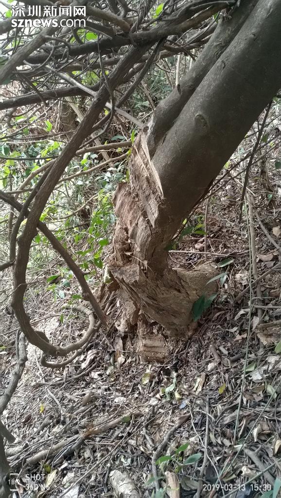 該網友提及的應人石村位于深圳石巖,從地圖上看,其“后山”與羊臺山森林公園連為一體,是附近居民閑暇時度假踏青的重要選擇。據了解,網友“詩奴L”于今年3月中旬上山游玩,游玩途中發(fā)現原本茂盛的野生沉香樹大多遭人砍伐。“不法分子窮盡一切手段,用鉆、削、劈、鋸等來對沉香樹進行摧殘,這簡直是屠殺式的洗劫!”該網友表示,看到這么多野生沉香樹被殘暴砍伐,真地讓人很氣憤。