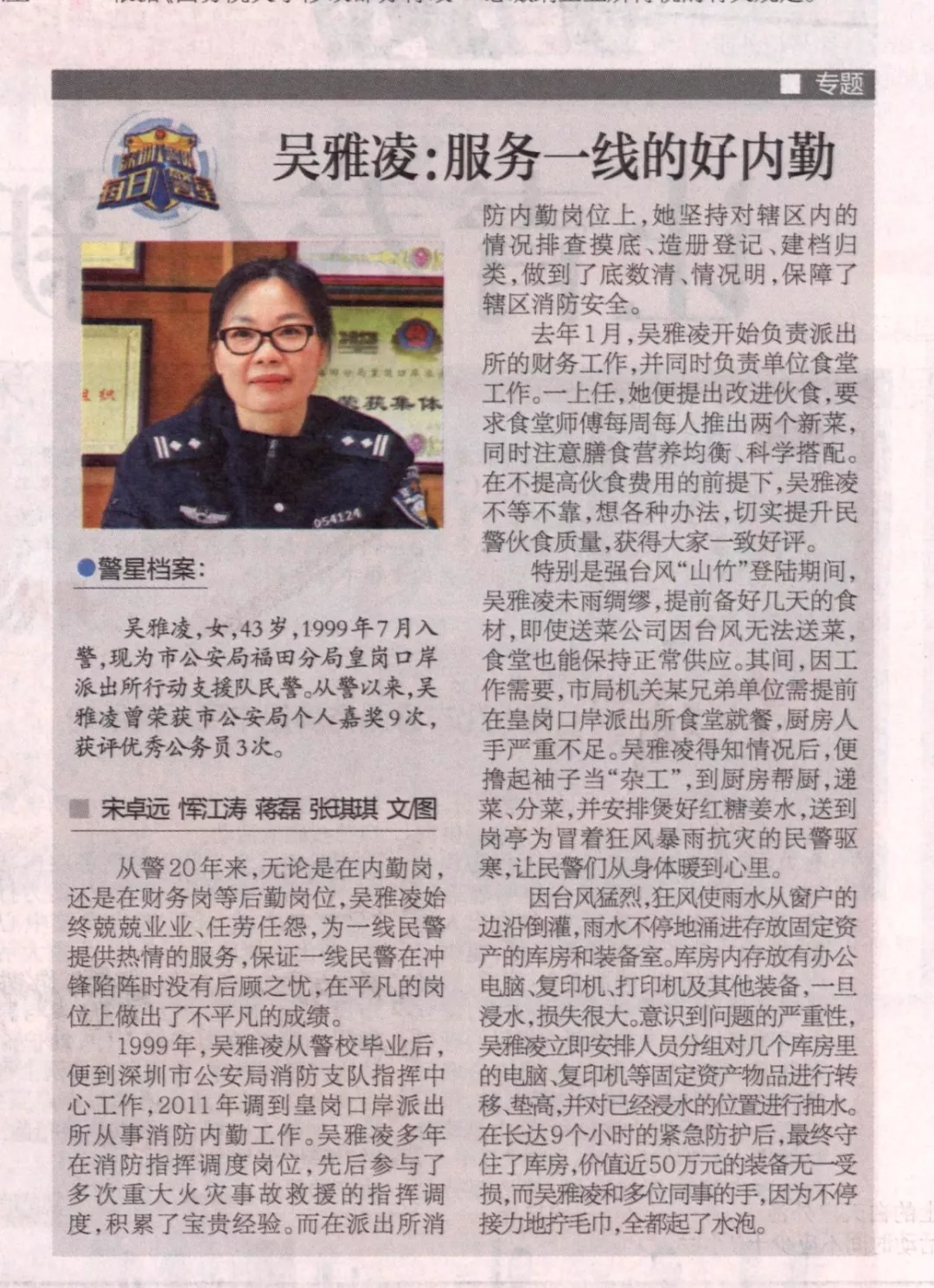 1999年,吳雅凌從警校畢業(yè)后,便到深圳市公安局消防支隊(duì)指揮中心工作,2011年調(diào)到皇崗口岸派出所從事消防內(nèi)勤工作。吳雅凌多年駐扎在消防指揮調(diào)度崗位,先后參與了多次重大火災(zāi)事故救援的指揮調(diào)度,積累了寶貴經(jīng)驗(yàn)。而在派出所消防內(nèi)勤崗位上,她堅(jiān)持對(duì)轄區(qū)內(nèi)的情況排查摸底、造冊(cè)登記、建檔歸類(lèi),做到了底數(shù)清、情況明,保障了轄區(qū)消防安全。