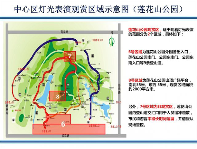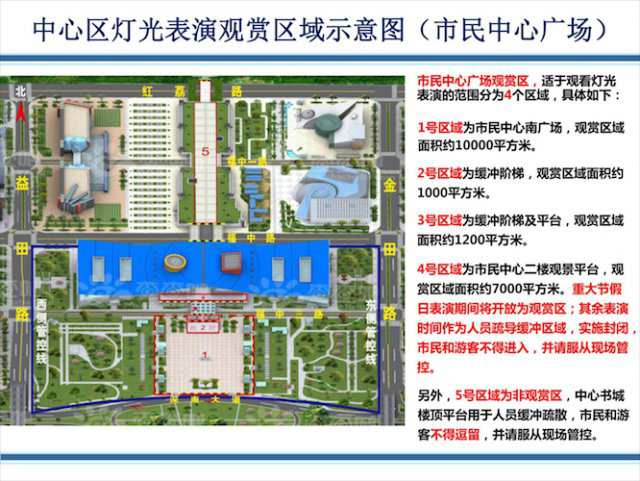 ▲中心區(qū)燈光表演觀賞區(qū)域示意圖(含市民中心廣場和蓮花山公園)