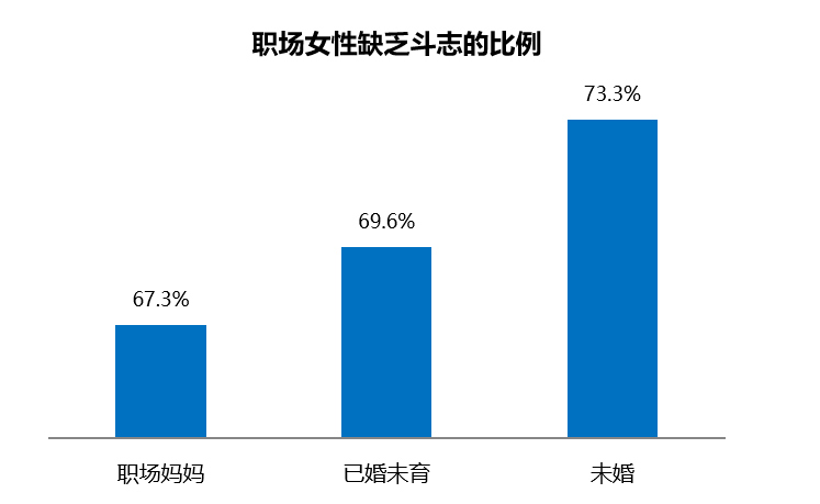 盡管來(lái)自生活和事業(yè)的雙重壓力較大,但是職場(chǎng)媽媽的職場(chǎng)斗志依然高昂。調(diào)查顯示,整體來(lái)看職場(chǎng)女性不加班的比例不足三成,職場(chǎng)媽媽群體的加班強(qiáng)度略僅低于其他女性職場(chǎng)人,有31.1%的職場(chǎng)媽媽不用加班。雖然職場(chǎng)的外部競(jìng)爭(zhēng)環(huán)境壓力大,但職場(chǎng)媽媽奮斗拼搏的精神氣很高。調(diào)研顯示,職場(chǎng)媽媽"經(jīng)常或偶爾出現(xiàn)缺乏工作斗志"的比例最低,為67.3%;已婚未育排在次位;未婚女性人群中缺少斗志的占比高達(dá)73.3%。