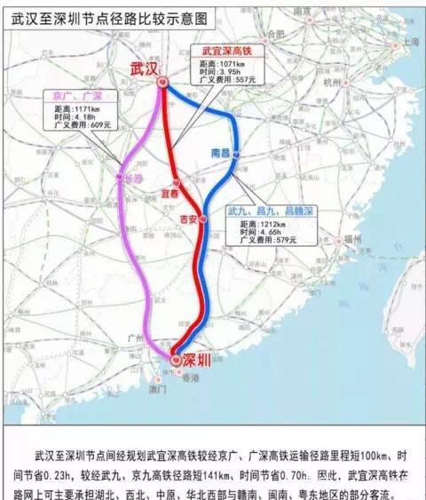 據(jù)了解,為了分流日益飽和的京廣高鐵客流,湖北提出擬在武漢和深圳之間建設(shè)一條高鐵。武深高鐵大致走向?yàn)椋何錆h -咸寧 -修水 -銅鼓 -宜豐 -萬(wàn)載 -宜春 -安福 -井岡山 -遂川 -贛州 -深圳。一旦建成,將形成武漢到深圳的一條筆直線(xiàn)路。初步預(yù)測(cè)分析,新規(guī)劃的武漢至深圳高速鐵路,較經(jīng)京廣、廣深高鐵運(yùn)輸徑路里程短100多公里,時(shí)間節(jié)省20分鐘;較經(jīng)武九、京九高鐵徑路短141公里,時(shí)間節(jié)省42分鐘。