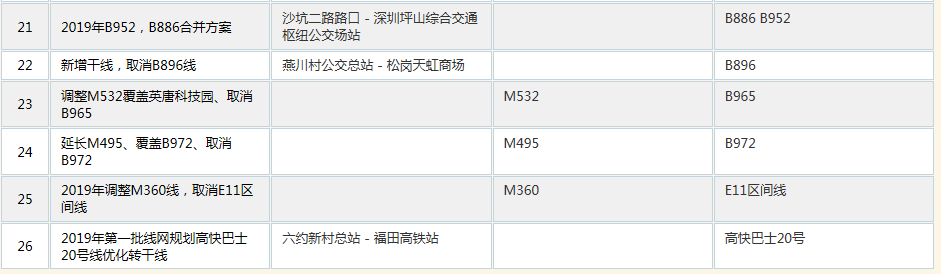 深圳新聞網(wǎng)5月20日訊(記者 涂勝)5月20日下午,深圳市交通運(yùn)輸局發(fā)布關(guān)于征求《2019年第一批公共汽車線路規(guī)劃方案》(征求意見稿)意見的通告。記者從規(guī)劃方案中的獲悉,本次線路公共汽車線路規(guī)劃方案以完成各區(qū)骨干網(wǎng)搭建及區(qū)域間快線、骨干線網(wǎng)銜接為工作重點,共包含線路方案63個,涉及線路79條(其中,新增5條,調(diào)整24條,合并、取消50條,運(yùn)力從原特區(qū)內(nèi)向原特區(qū)外轉(zhuǎn)移58臺)。