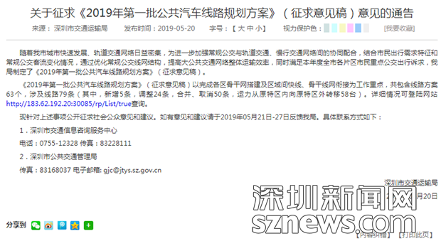 目前,市民可登陸網(wǎng)站http://jtys.sz.gov.cn/查詢詳細(xì)情況。同時,深圳市交通運(yùn)輸局就上述事項公開征求社會公眾意見和建議,如有意見和建議請于2019年05月21日-27日反饋至深圳市交通運(yùn)輸局。具體聯(lián)系方式如下: