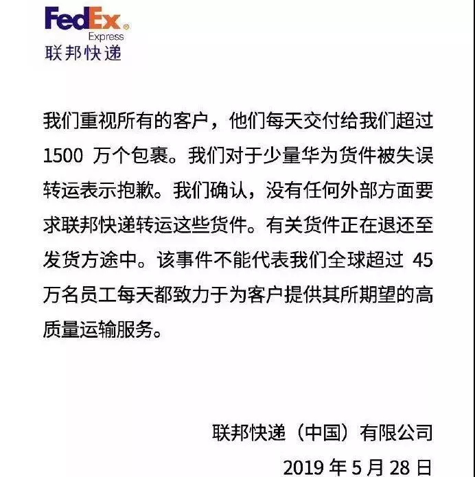 聯(lián)邦快遞(中國)公司28日在其社交媒體官方賬號稱,“我們對于少量華為貨件被失誤轉(zhuǎn)運表示抱歉。我們確認,沒有任何外部方面要求聯(lián)邦快遞轉(zhuǎn)運這些貨件。有關(guān)貨件正在退還至發(fā)貨方途中?!?/p>