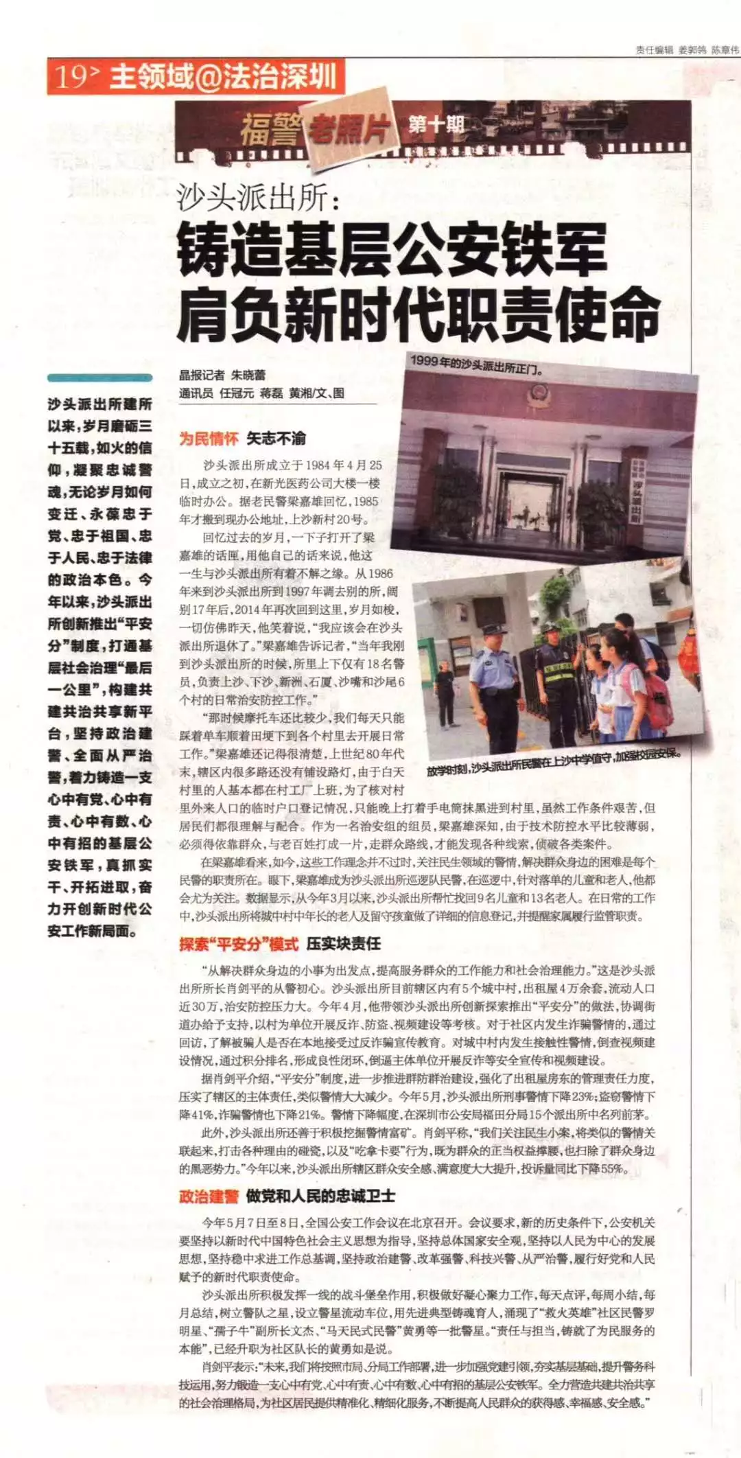 沙頭派出所積極發(fā)揮一線的戰(zhàn)斗堡壘作用,積極做好凝心聚力工作,每天點(diǎn)評(píng),每周小結(jié),每月總結(jié),樹立警隊(duì)之星,設(shè)立警星流動(dòng)車位,用先進(jìn)典型鑄魂育人,涌現(xiàn)了“救火英雄”社區(qū)民警羅明星、“孺子?!备彼L(zhǎng)文杰、“馬天民式民警”黃勇等一批警星?!柏?zé)任與擔(dān)當(dāng),鑄就了為民服務(wù)的本能”,已經(jīng)升職為社區(qū)隊(duì)長(zhǎng)的黃勇如是說。