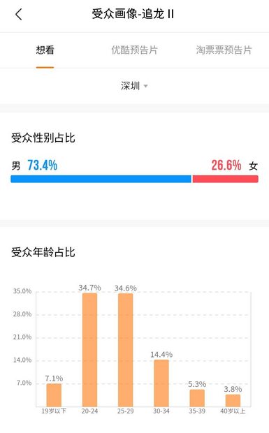 阿里影業(yè)旗下的燈塔專業(yè)版數(shù)據(jù)中顯示,深圳影迷在《追龍2》的受眾畫(huà)像男性占比73.4%,遠(yuǎn)高于女性,且在受眾年齡占比當(dāng)中,20-30歲群體是主要受眾群。