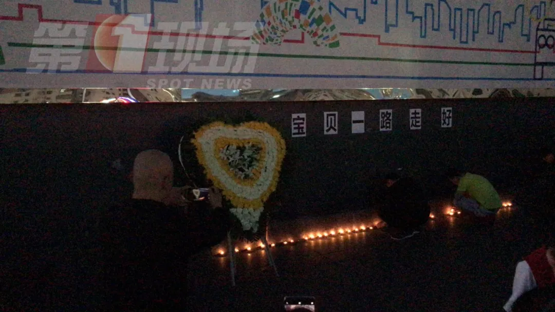 在廣場(chǎng)正中央,放立著一個(gè)心形花牌,大家在地上點(diǎn)上了蠟燭,墻面貼著“寶貝一路走好”。