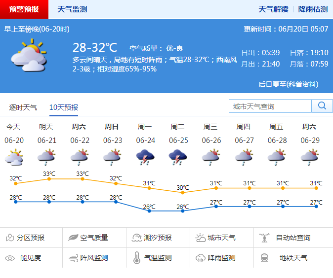 預計中考期間(6月22日至24日)天氣炎熱,部分時間有雷陣雨。其中,20日至22日多云炎熱,23日至24日多云間陰天,有雷陣雨,提醒考生做好防暑降溫準備。