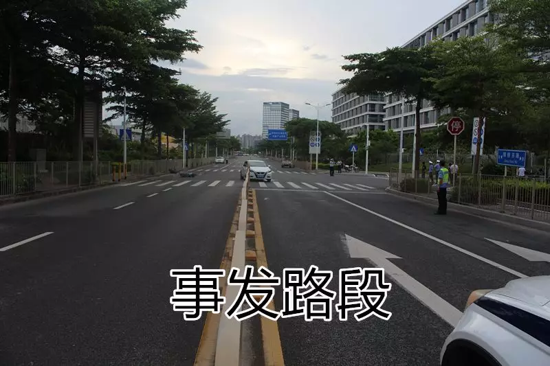 事故現(xiàn)場位于坪山區(qū)錦繡東路與盧輝路交匯路口,道路為機(jī)動(dòng)車道、普通路段的平直道路,路面完好、干燥,照明條件為夜間有路燈照明,干燥瀝青路面,交通信號方式為指示標(biāo)線、指示標(biāo)志,道路類型為一般城市道路。