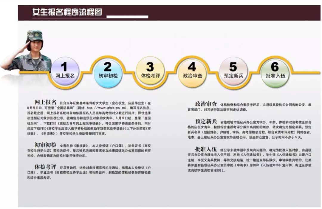 女兵招收對象:普通高中應屆畢業(yè)生(含高校新生)、普通全日制高校在校生及應屆畢業(yè)生,年滿17至22周歲。