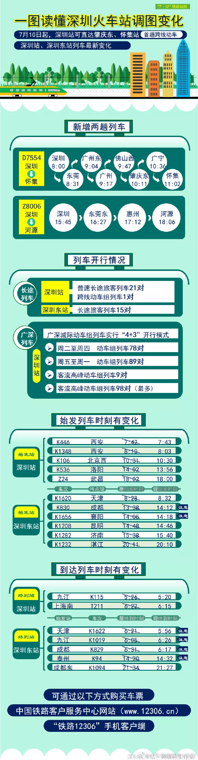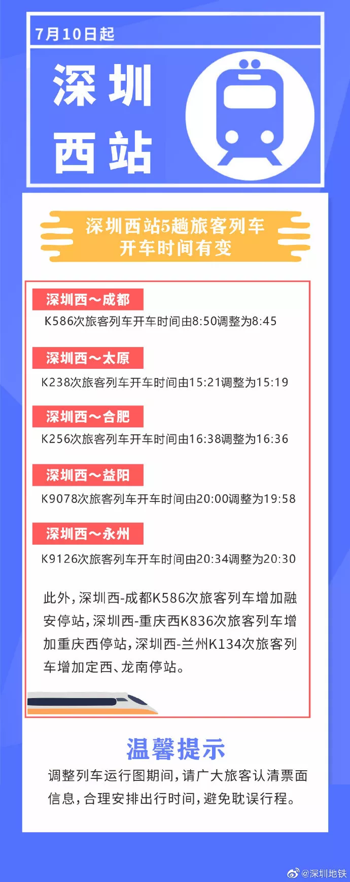 深圳西站有5趟旅客列車開車時間有變,3趟旅客列車增加停車站。
