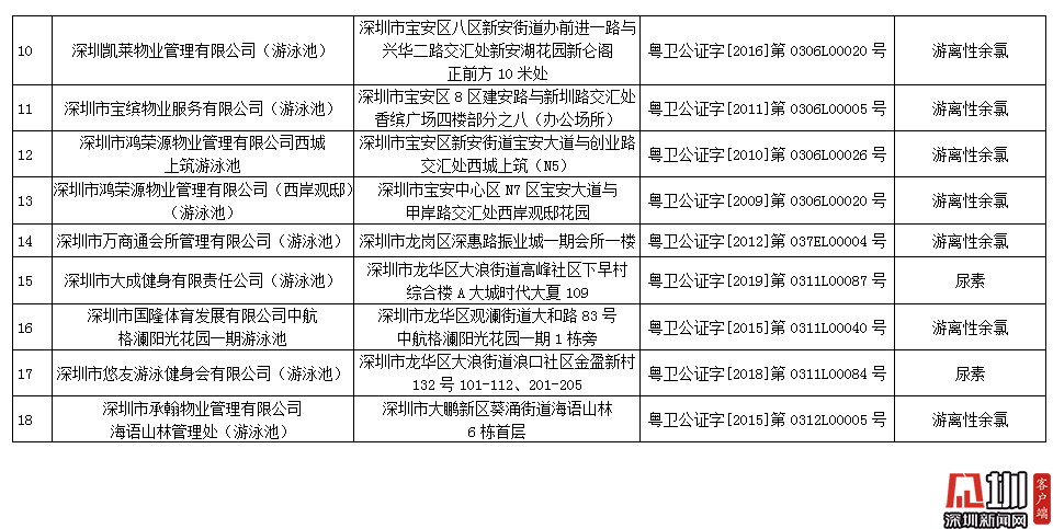 記者獲悉,深圳市夢六健身有限公司(游泳池)pH值和游離性余氯指標(biāo)不合格,深圳市百利行物業(yè)發(fā)展有限公司中信紅樹灣花城物業(yè)管理處(游泳池)、深圳市大成健身有限責(zé)任公司(游泳池)、深圳市悠友游泳健身會有限公司(游泳池)尿素指標(biāo)不合格,加福投資(深圳)有限公司福朋喜來登酒店(游泳池)、深圳市蓮花物業(yè)管理有限公司彩田村游泳場、深圳大中華國際酒店管理有限公司大中華希爾頓酒店(游泳池)、深圳市京基物業(yè)管理有限公司濱河時代物業(yè)服務(wù)中心(游泳池)、深圳新都酒店股份有限公司新都酒店(游泳池)、深圳陽光酒店(游泳池)、深圳市金地物業(yè)管理有限公司翠盈嘉園管理處(游泳池)、深圳凱萊物業(yè)管理有限公司(游泳池)、深圳市寶繽物業(yè)服務(wù)有限公司(游泳池)、深圳市鴻榮源物業(yè)管理有限公司西城上筑游泳池、深圳市鴻榮源物業(yè)管理有限公司(西岸觀?。ㄓ斡境兀?、深圳市萬商通會所管理有限公司(游泳池)、深圳市國隆體育發(fā)展有限公司中航格瀾陽光花園一期游泳池、深圳市承翰物業(yè)管理有限公司海語山林管理處(游泳池)游離性余氯指標(biāo)不合格。衛(wèi)生監(jiān)督部門已責(zé)令抽檢結(jié)果不合格單位立即整改,并跟蹤整改情況。
